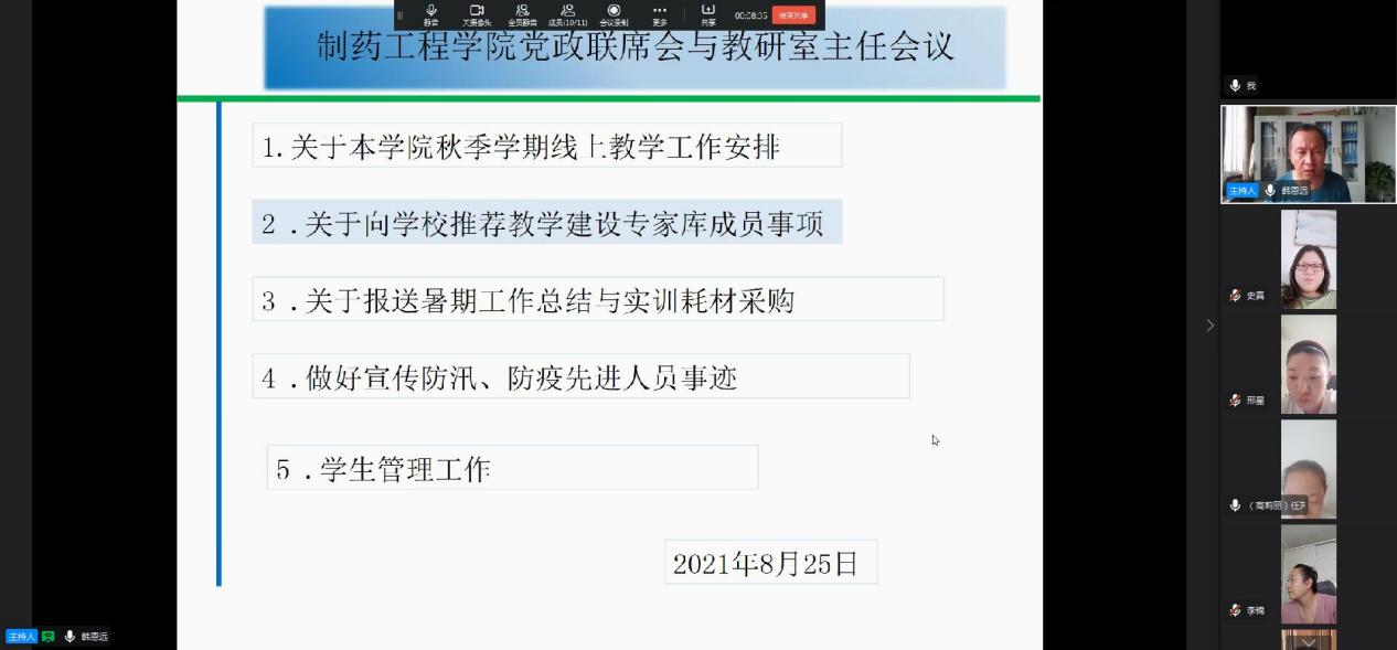 制药工程学院于2021年8月25日下午,通过钉钉平台召开党政联席扩大会议,学院党政班子和教研室主任参加会议。