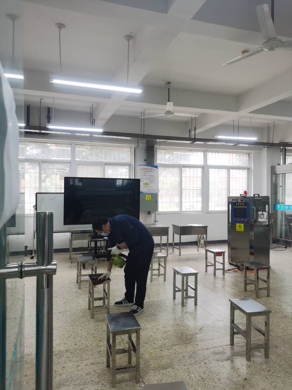 演练开始由方案总指挥制药工程学院院长韩恩远提出相关要求,每位参演同志按照角色进入演练,从场所消毒,体温测量到学生进入实训室等每个步骤都进行了严格要求,以防疫实战状态进行。