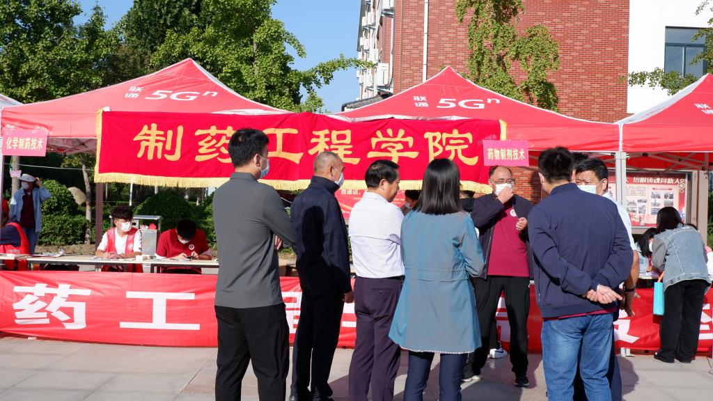 在开封校区南院迎新场地,魏新华一行先后查看了新生报到通道、报到流程设置、新生辅导员和班主任配备情况及疫情防控工作安排等情况,由制药工程学院院长吕玮介绍了了学院的专业情况、设置情况、专业发展、学生管理情况。