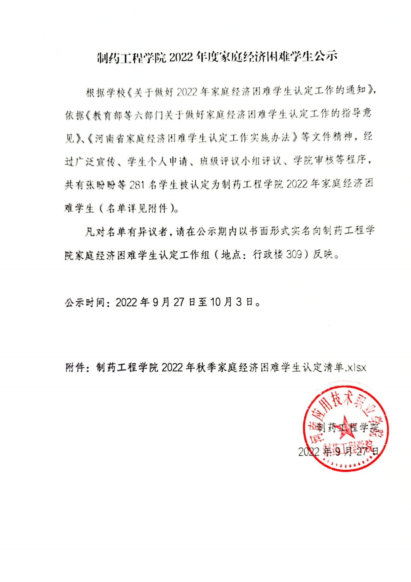 制药工程学院2022年度家庭经济困难学生公示